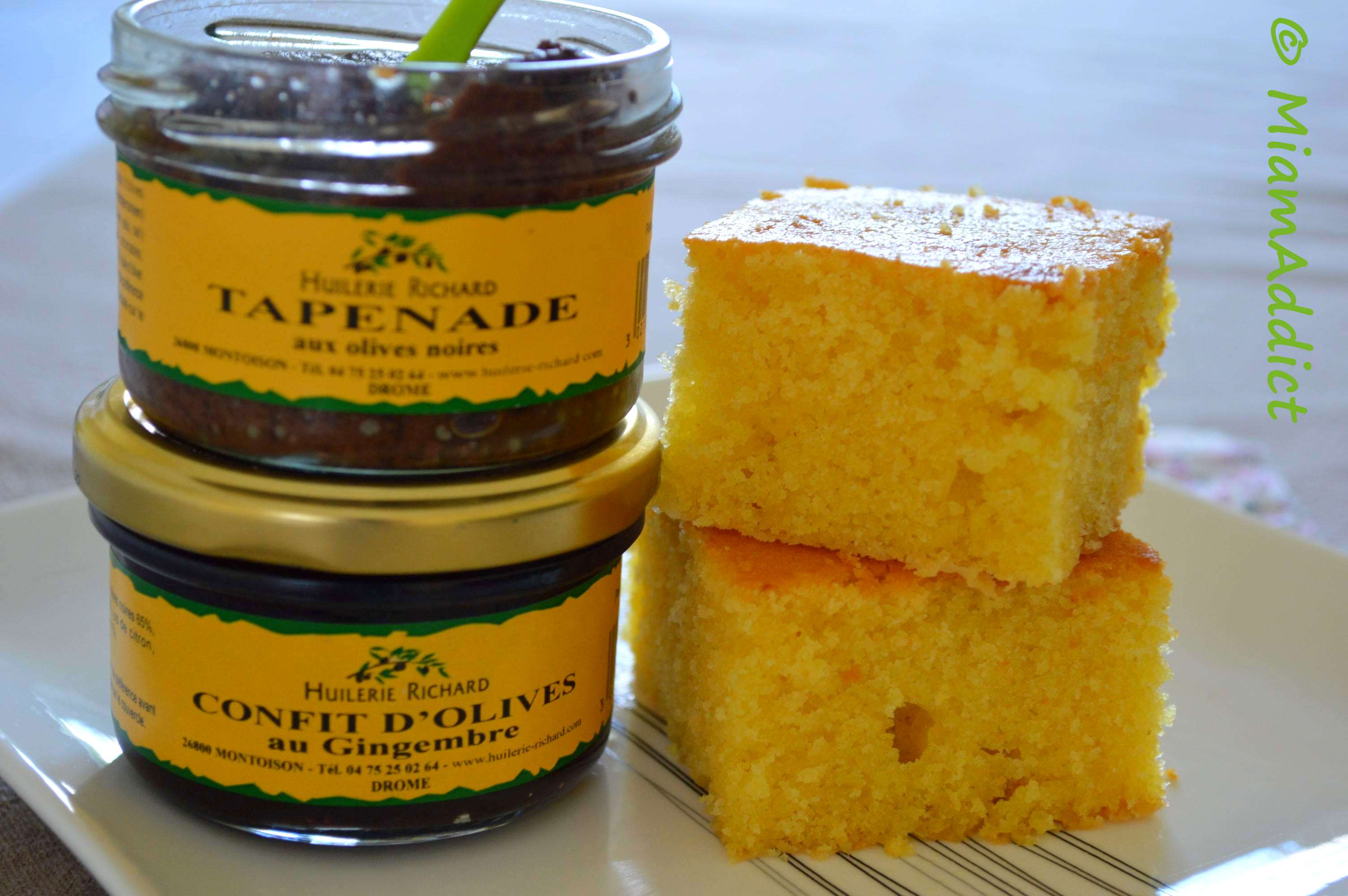 Comme Nelly le conseillait dans son article, je l’ai servi avec du salé, à l’apéritif : la tapenade aux olives noires et le confit d’olives au gingembre de mon partenaire Huilerie Richard. Un mariage qui peut effectivement sembler surprenant au départ mais, le goût sucré du Corn Bread et la saveur puissante de la tapenade s’équilibrent et s’associent à merveille.